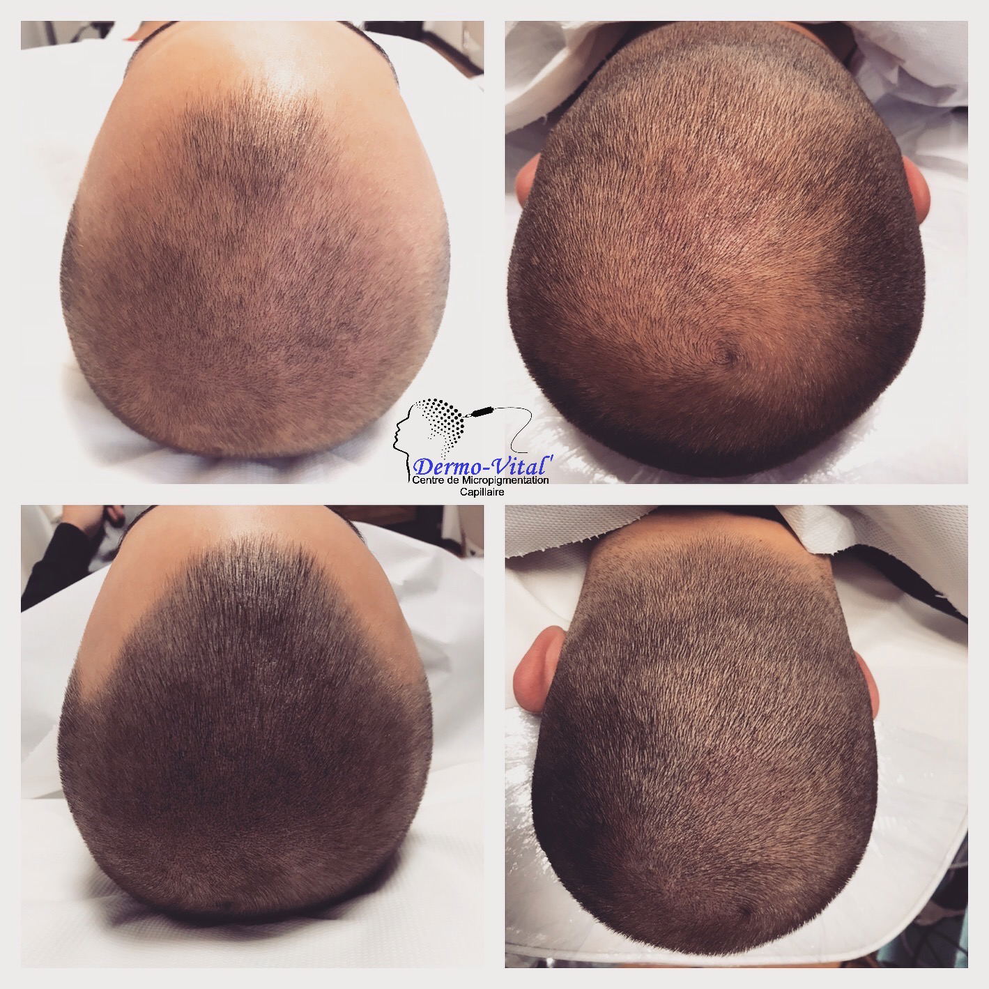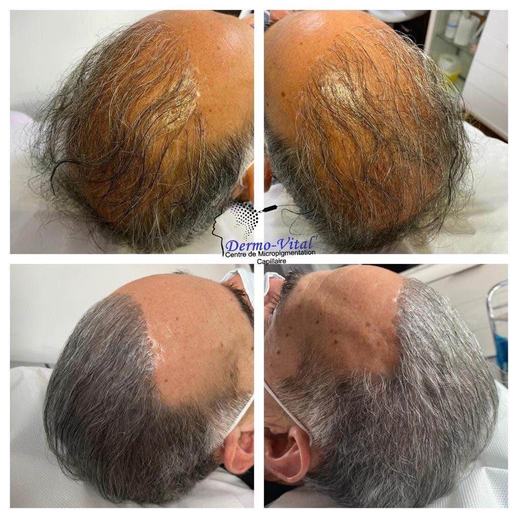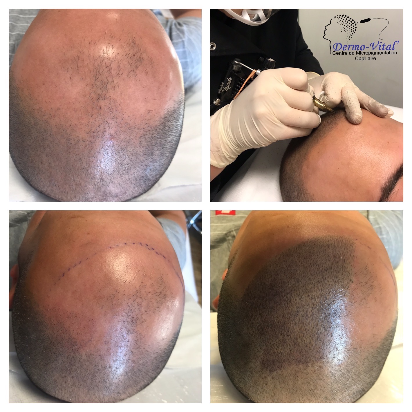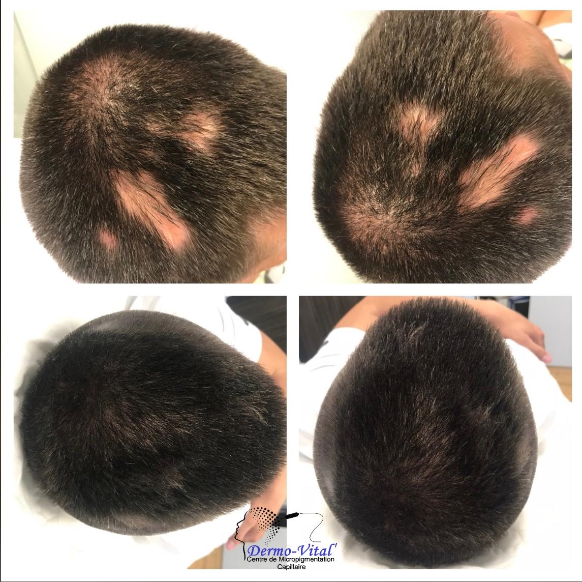 Cette technique permet de recréer une densité capillaire ou un effet « crâne rasé » hyperréaliste, camouflant efficacement calvitie, alopécie, pelade ou cicatrices.