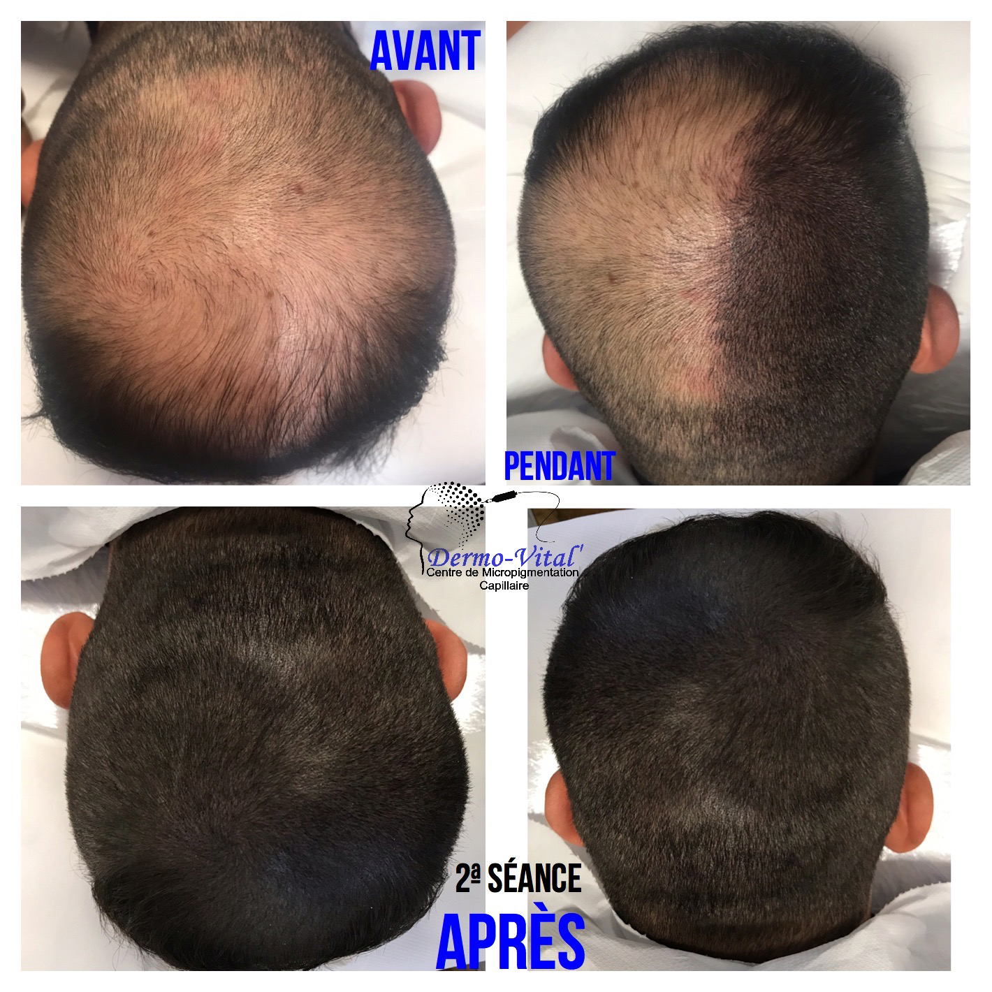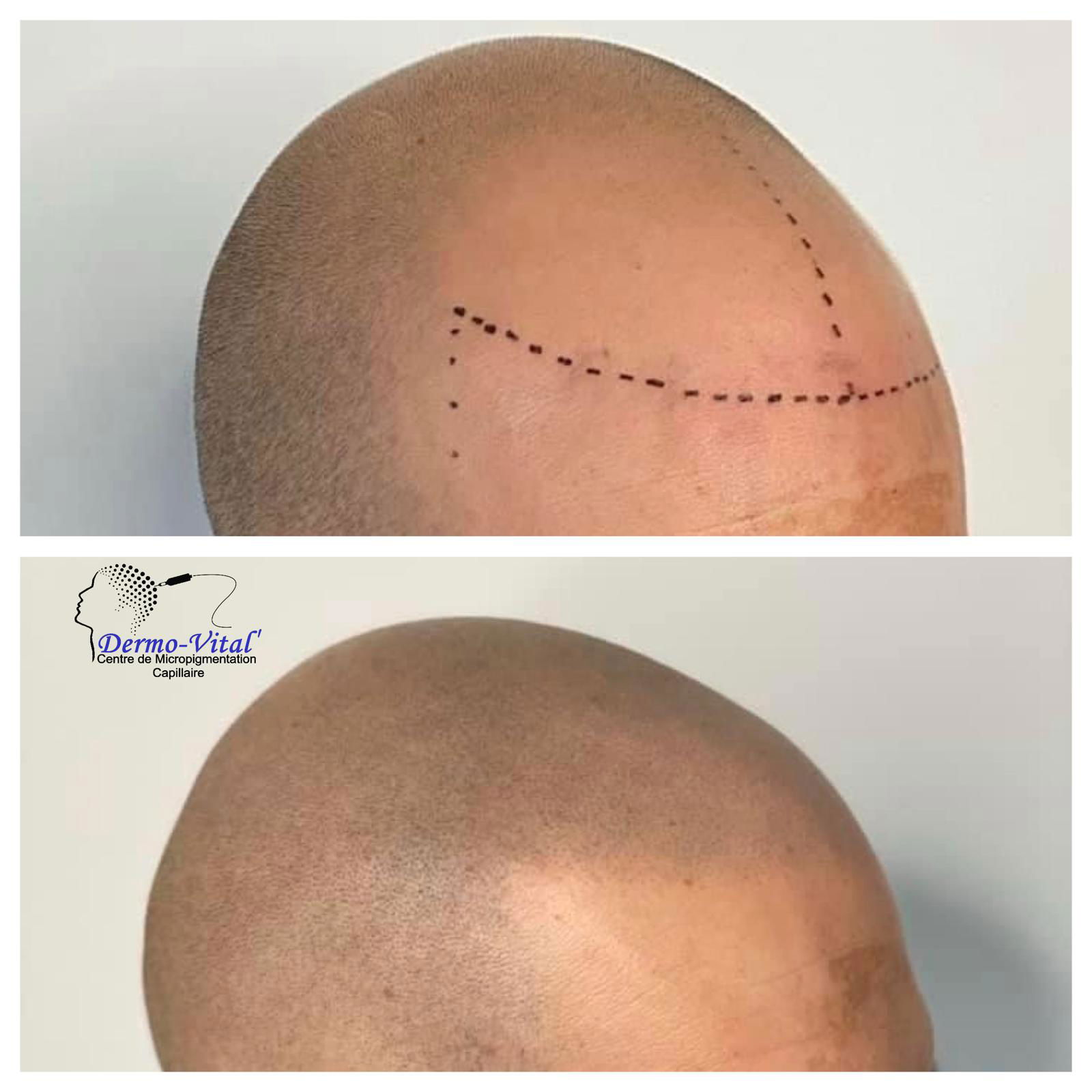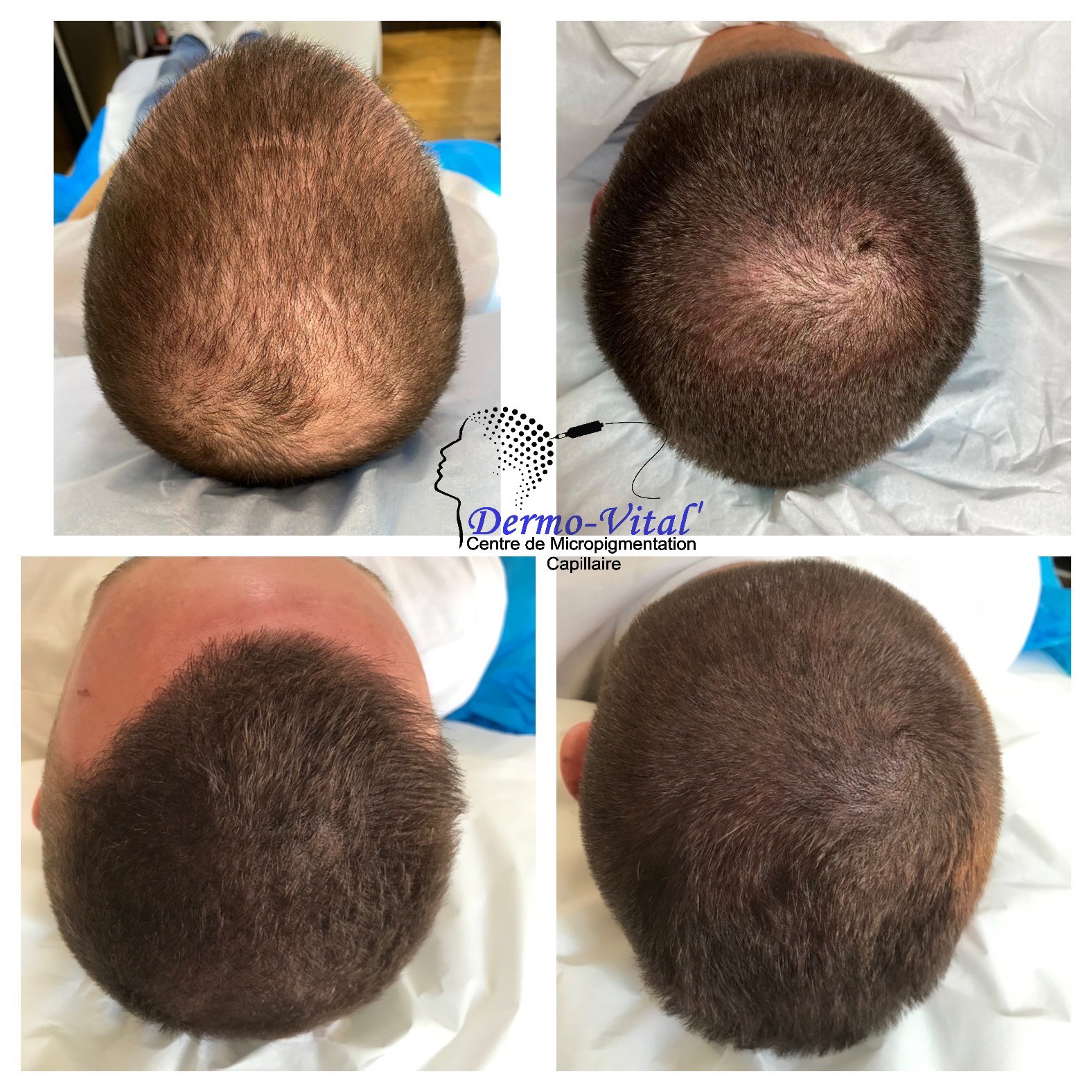 Cette technique permet de recréer une densité capillaire ou un effet « crâne rasé » hyperréaliste, camouflant efficacement calvitie, alopécie, pelade ou cicatrices.